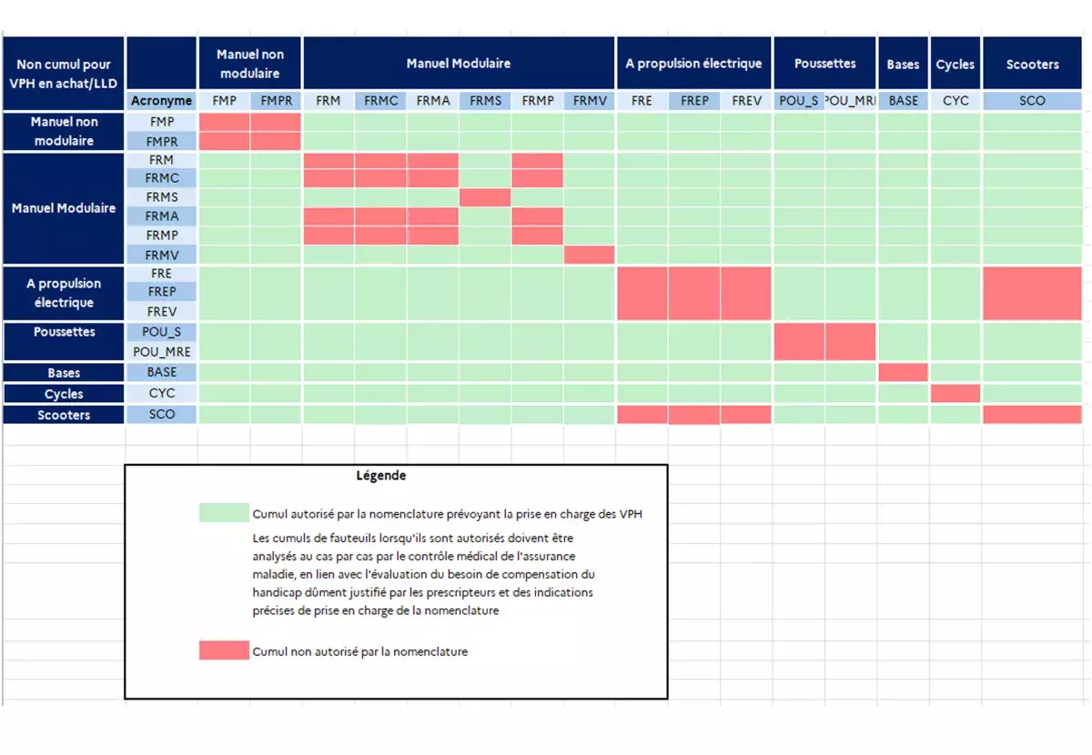La nouvelle nomenclature permet les cumuls de fauteuils suivants entre différentes catégories de fauteuils. La demande de remboursement d’un second fauteuil même si elle est permise par la nomenclature, doit être dûment justifiée par le ou les prescripteur(s) au regard du besoin de compensation de l’usager et de son environnement et fera l’objet d’une analyse par les services du contrôle médical de l’assurance maladie.